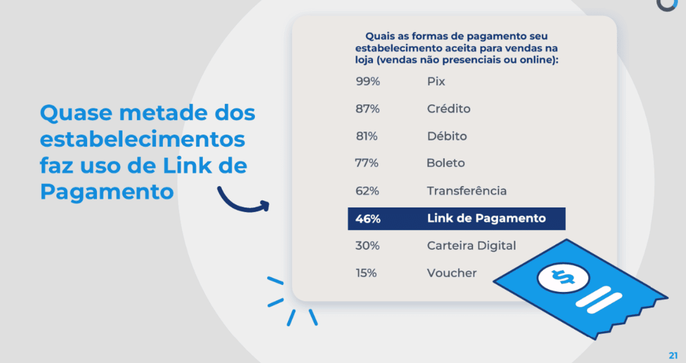 Conforme a “Pesquisa Cielo de Hábitos de Pagamento no Varejo”, quase metade dos estabelecimentos já usa link de pagamento para fazer vendas online ou não presenciais. Além disso, 1 em cada 4 estabelecimentos já aceita carteiras digitais.