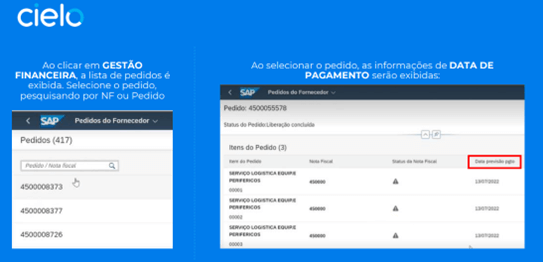 Após a liberação, o acesso é feito via login SAP pelo link https://cielo-prd-compras-portalfornecedor-mta-approuter.cfapps.br10.hana.ondemand.com com as credenciais cadastradas.