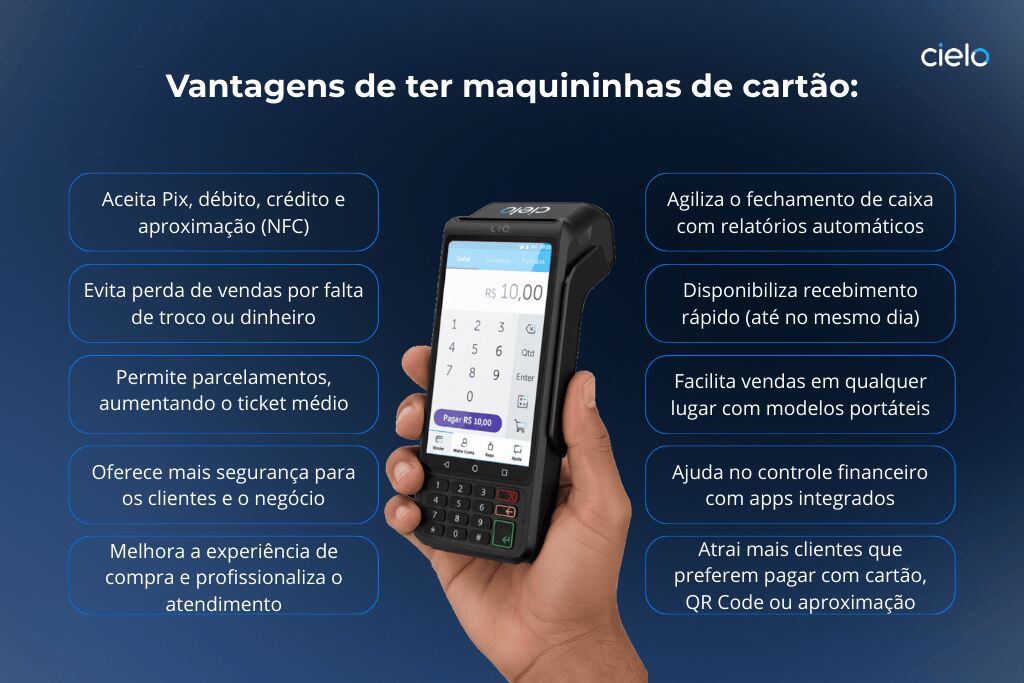 | Vendas via celular | Cielo Tap | Transforma o celular em maquininha, aceita Pix, crédito e débito, sem necessidade de máquina física |